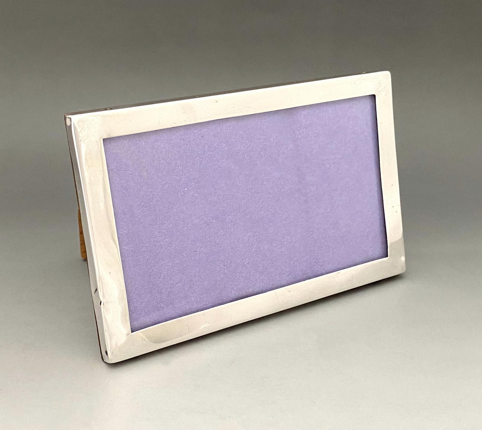 Elegant George V antique silver photo frame of rectangular form and suitable for both landscape and portrait orientation. This useful and attractive example is of easel construction with an oak wooden back and a stylish and understated silver body. A lovely vintage example, ready for immediate use.