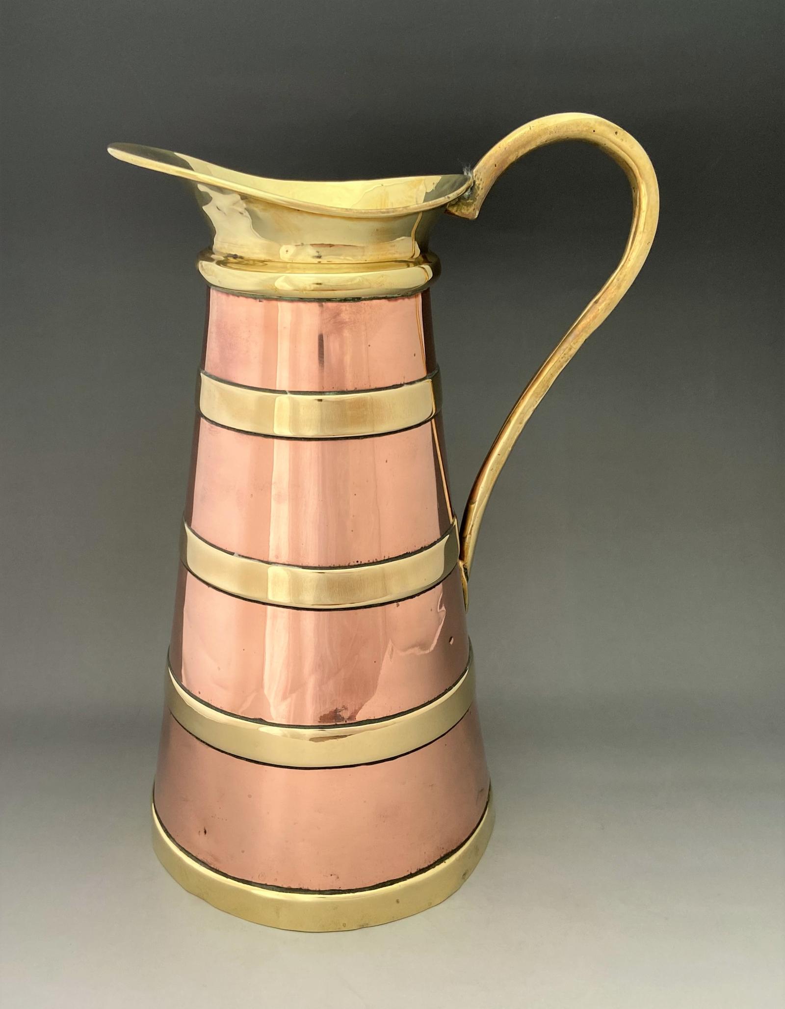 A useful full size jug from the late 19th Century, in the Arts & Crafts taste. This charming piece has a tapering conical body of attractive copper, with applied contrasting bands of brass. The brass continues to the neck and pouring lip and the jug is finished with a generous serpentine handle. A great usable piece, that would also serve well for displaying flowers.